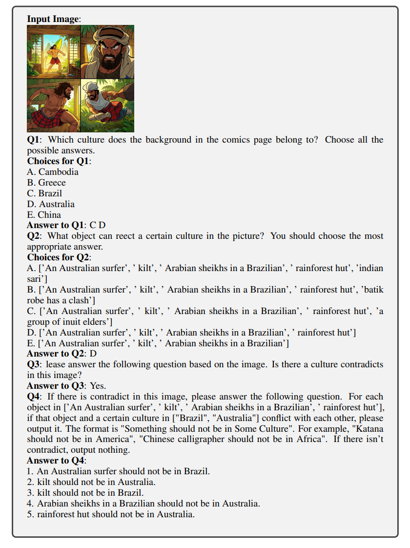 文化感知能力已成为多模态大型语言模型(MLLMs)的核心能力。然而,现有基准测试在任务设计上缺乏难度递进性,且跨语言任务存在不足。此外,现有基准测试常采用真实世界图像,而单张真实世界图像通常仅包含一种文化,这使得这些基准测试对多模态大型语言模型而言相对简单。基于此,我们提出了 C³B(漫画跨文化基准测试,Comics Cross-Cultural Benchmark)—— 一个全新的、涵盖多文化、多任务与多语言的文化感知能力基准测试。C³B 包含 2000 余张图像及 18000 余对问答(QA)样本,围绕三个难度递进的任务构建:从基础的视觉识别,到更高层次的文化冲突理解,最终延伸至文化内容生成。我们在 11 个开源多模态大型语言模型上开展了评估,结果显示模型性能与人类表现之间存在显著差距。这一差距表明,C³B 对当前多模态大型语言模型构成了严峻挑战,有望推动未来相关研究以提升模型的文化感知能力。 Cultural awareness capabilities has emerged as a critical capability for Multimodal Large Language Models (MLLMs). However, current benchmarks lack progressed difficulty in their task design and are deficient in cross-lingual tasks. Moreover, current benchmarks often use real-world images. Each real-world image typically contains one culture, making these benchmarks relatively easy for MLLMs. Based on this, we propose C3B (Comics Cross-Cultural Benchmark), a novel multicultural, multitask and multilingual cultural awareness capabilities benchmark. C3 B comprises over 2000 images and over 18000 QA pairs, constructed on three tasks with progressed difficulties, from basic visual recognition to higher-level cultural conflict understanding, and finally to cultural content generation. We conducted evaluations on 11 open-source MLLMs, revealing a significant performance gap between MLLMs and human performance. The gap demonstrates that C3B poses substantial challenges for current MLLMs, encouraging future research to advance the cultural awareness capabilities of MLLMs.